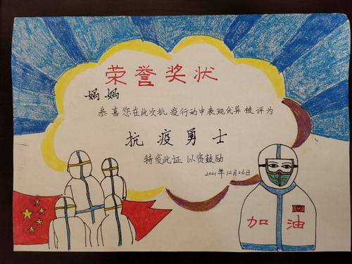 我们为身边有这样的英雄感到幸福和安心,孩子们为自己有这样的父母感到骄傲和自豪。辞旧迎新之际,在学校德育处和关工委的倡导下,孩子们用稚嫩的双手精心绘制了独一无二的奖状,特颁发给家中的抗疫英雄,一起来看看这荣誉时刻吧!