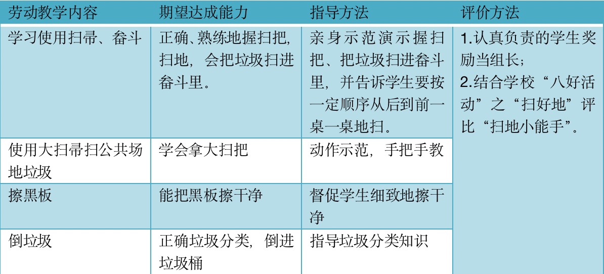 图7:融入生活“自然渗透式”劳动教育课程 (一)基于生活,重塑正确、科学的劳动教育意识 家庭是孩子的第一所学校。低年级学生模仿力强,会潜移默化地受到家长言行的影响。因此,学生劳动能力的培养,家庭是主阵地,家长承担着极为重要的责任。 一方面,转变家长重智轻劳思想。我们可以通过开学第一课、家长会、家长课堂等多种途径倡导,使家长正确认识劳动育人的价值——孩子通过劳动发现问题,探索、解决问题的过程就是教育。同时,提高家长的劳动教育意识,知道劳动是德智体美劳“五育”之一,教育应该是五育齐发,所以要重拾弱化了的劳动。再者,还要让家长了解,劳动是养成品德、健身强体、增智开慧、培养美感的首要手段。家长心动了才会有行动,才会自动投入劳动教育中。 另一方面,改进家长劳动教育方法。要让家长知道对孩子进行劳动教育要讲究方法和兴趣等。我们可以通过教师指导、家长间经验交流等多种方法,让家长改进对孩子的劳动教育方法:注重言传身教,细化过程,讲解与示范同步,让孩子边观察边模仿;还可创设一些比赛、游戏等情景,让孩子在玩乐中学习劳动技能,促使对劳动的兴趣越发浓厚;对劳动的成果多渲染、多肯定,让孩子在赞美中,体会到劳动的喜悦,便会乐此不疲。 (二)源于生活,搭建自然、开放的劳动教学课程 针对劳动教学内容无序化和教学方法简单化的问题,我们关注到了生活与劳动紧密相连的特点,提议搭建“融入生活的自然渗透式劳动”教学课程。 1.结合学生真实生活,确立劳动教学内容 我们根据《教育部出台的大中小学劳动教育“学段手册”》和学生的年龄特点,从“个人卫生、着装整理、学习准备、简单家务、教室清洁”五个方面入手,梳理“低年级学生劳动能力清单”,有序地开展劳动教育。 表3:低年级学生劳动能力清单