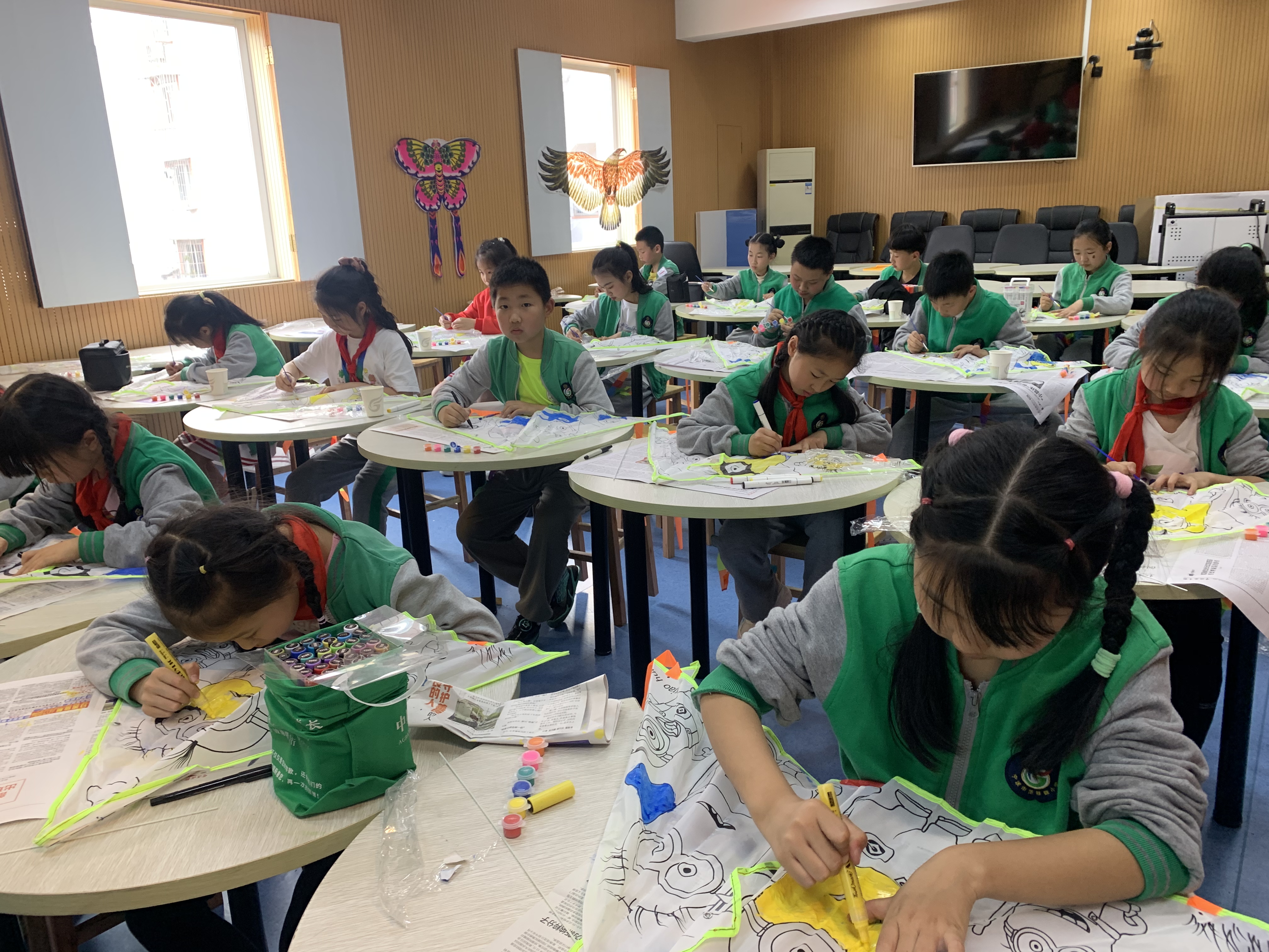 5月10日下午,宁波市范桂馥小学邀请海曙区银发非遗文化传承工作室老师,给孩子们带来了两堂“非遗文化课”——趣玩空竹、手绘风筝,收到了学校、孩子的热烈欢迎。 微格教室,20位孩子在海曙区非遗文化传承工作组老师的指导下进行画风筝活动。风筝是中国古老的传统文化之一,代表着国人对天空的探索和幻想。孩子们挥动画笔,搭配自己喜欢的颜色,展现出一幅幅鲜艳的画卷,依托风筝,祈福好运。正所谓“儿童散学归来早,忙趁东风放纸鸢”,通过亲手绘制,孩子们近距离地感受风筝,传承中华民俗文化。 另一头,跆拳道馆,20位孩子也在区关工委老师们的指导下趣玩空竹。空竹,对于现代的孩子来说,比较陌生,关工委老师手把手教孩子们。没多久,一位位空竹高手就诞生了。抖空竹是民间传统游戏之一。2006年5月20日,抖空竹经国务院批准列入第一批国家级非物质文化遗产名录。孩子们左右手配合默契,感受着这一项双手舞动的非遗文化。 此次“非遗文化进校园”活动,赢得了学校老师和孩子们的纷纷点赞。通过引进区关工委老师的力量,丰富孩子们的拓展课,同时也将非遗文化植入孩子们幼小的心田,使其得以传承。