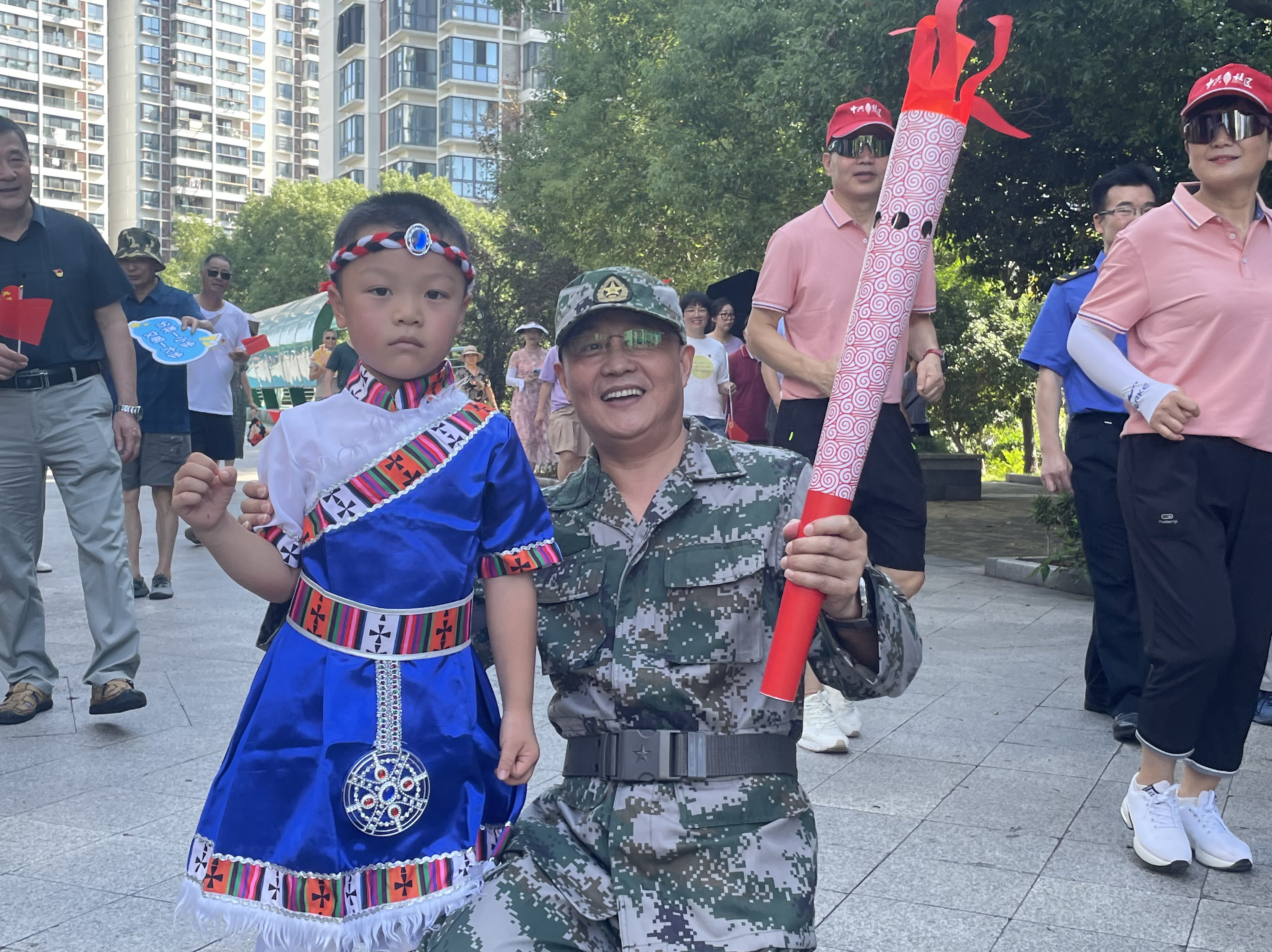 社区关工委组织芳辰丽阳幼儿园的小朋友担任护旗手和升旗手,并邀请社区负责人、“五老”、交警、退伍军人、少数民族儿童、各支部党员等各界代表共同参与火炬传递。