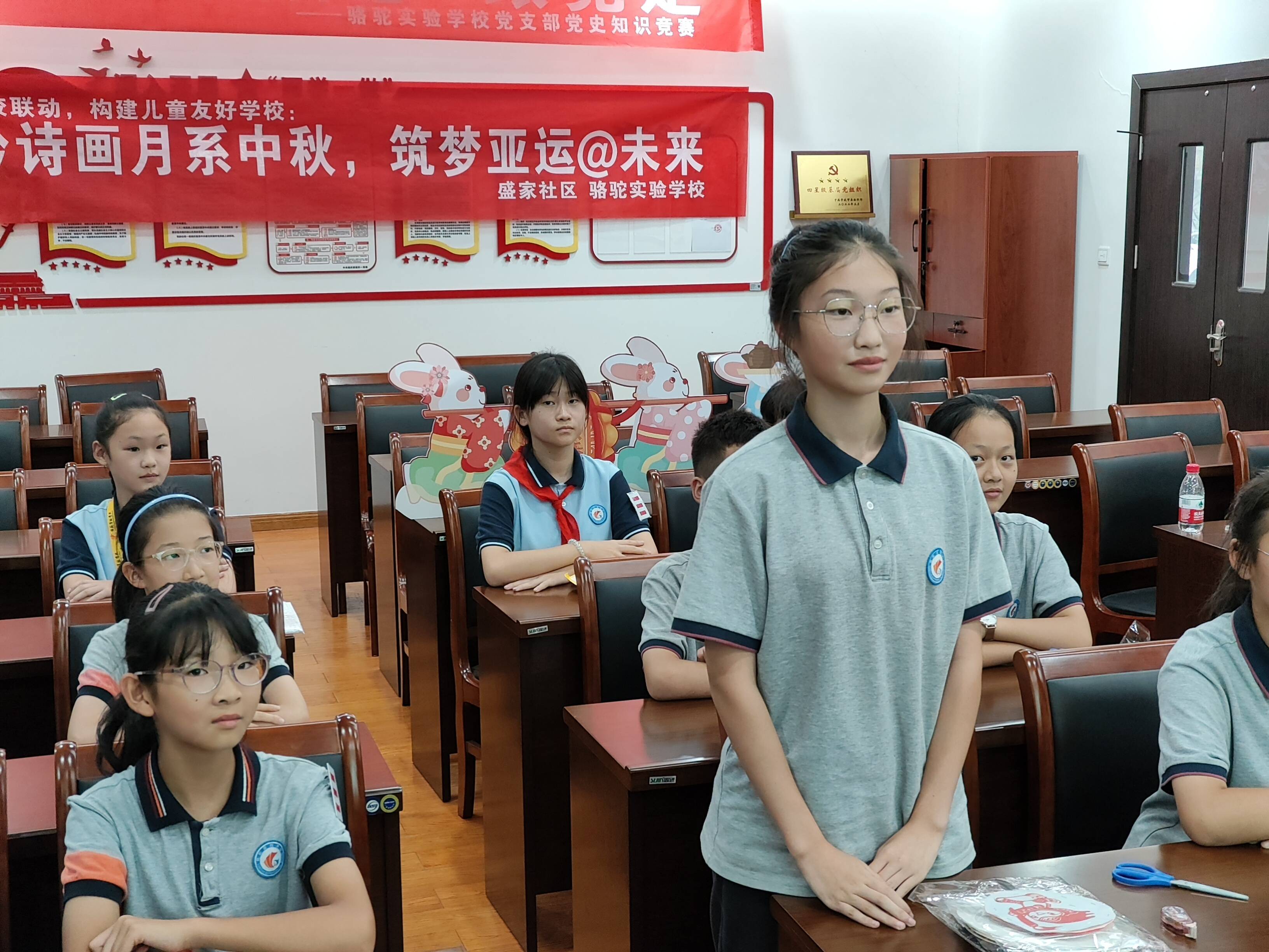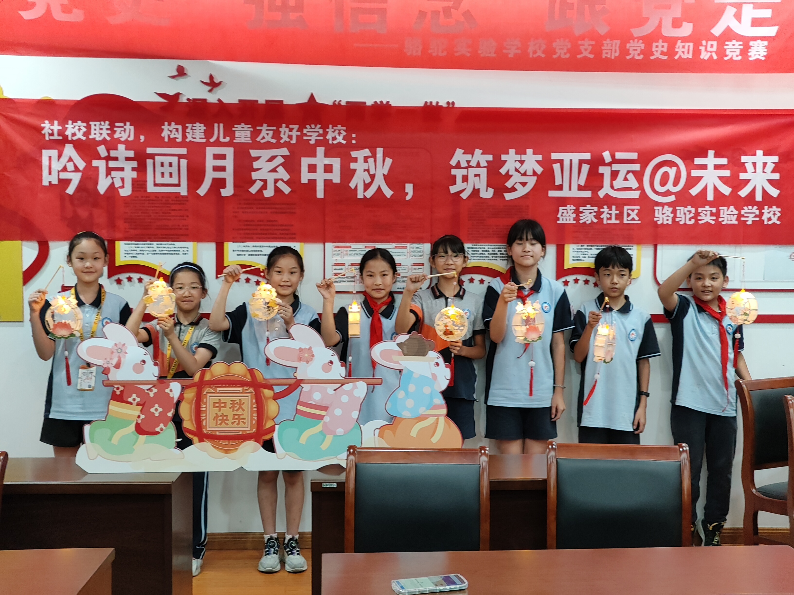 恰逢亚运会、中秋节来临之际,为了丰富校园内的文化生活,增进学生之间的友谊,9月21日下午,镇海区骆驼街道盛家社区关工委携手骆驼实验学校联合举办了一场别开生面的“吟诗画月系中秋,筑梦亚运@未来”主题活动。初中、小学部学生代表积极参与,现场气氛热烈,共同迎接亚运盛会与中秋佳节。