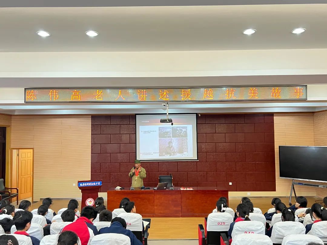 习近平总书记曾说:“一切向前走,都不能忘记走过的路。”4月1日,浙江省最美退役军人、镇海区关心下一代红枫志愿者协会老战士宣讲团团长陈伟高爷爷身着绿色军装、佩戴金灿灿的军功章来到澥浦中学讲述援越抗美故事,全体师生肃然起敬。