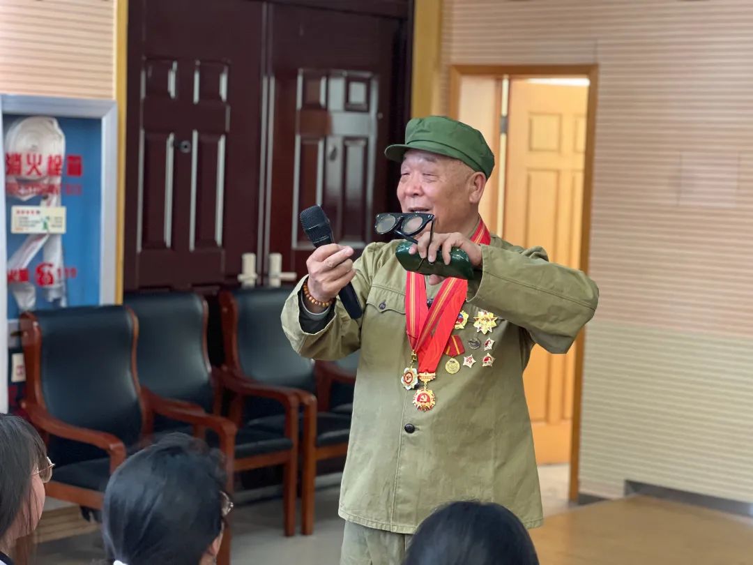 “50多年前,我们代表着伟大的祖国,伟大的中国人民,伟大的中国共产党,伟大的领袖毛主席,伟大的中国人民解放军,雄赳赳气昂昂地奔赴援越抗美的战场,感到无比的自豪和荣耀……” 这一段话拉开了故事的序幕,陈伟高爷爷结合自己援越抗美的战斗经历,带领大家一起追忆那一段段激情燃烧的革命岁月和波澜壮阔的奋斗历程。珍贵的图文资料,用于观察敌机的墨镜,敌机残骸铸成的小飞机,丰富的视听体验,深深地打动了在场的每一位师生。陈爷爷大无畏的革命精神和饱满的爱国热情也极大地感染了在场的每一个人。