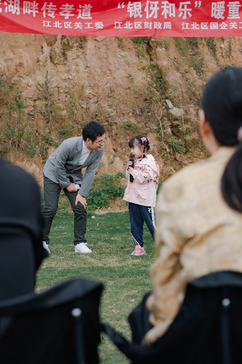 活动现场,孩子参加“慈孝故事讲解”。 在重阳节来临之际,今天,由江北区关工委、江北区财政局、江北区国有企业关工委精心策划的“银伢和乐”三代同堂重阳亲子活动在慈城五婆湖“森屿湖·Nature Land”亲子营地举行。活动吸引了30多户职工家庭的踊跃参与,祖辈、父辈与孩童们欢聚一堂。 “知道江北有哪些慈孝人物吗……江北的慈孝故事了解吗?” 活动在“慈孝文化科普”讲解员娓娓道来声中拉开了序幕,向大小朋友们讲述了“慈”与“孝”的深厚文化内涵与时代意义。孩子们稚嫩而真诚地回应,展现了孝道文化在新一代心中的萌芽。 “慈孝故事讲解”环节,各个家庭声情并茂地分享了古今中外的经典孝道故事与身边感人至深的敬老实例,“亲子游戏环节”让三代人通过互相协作,亲密互动。