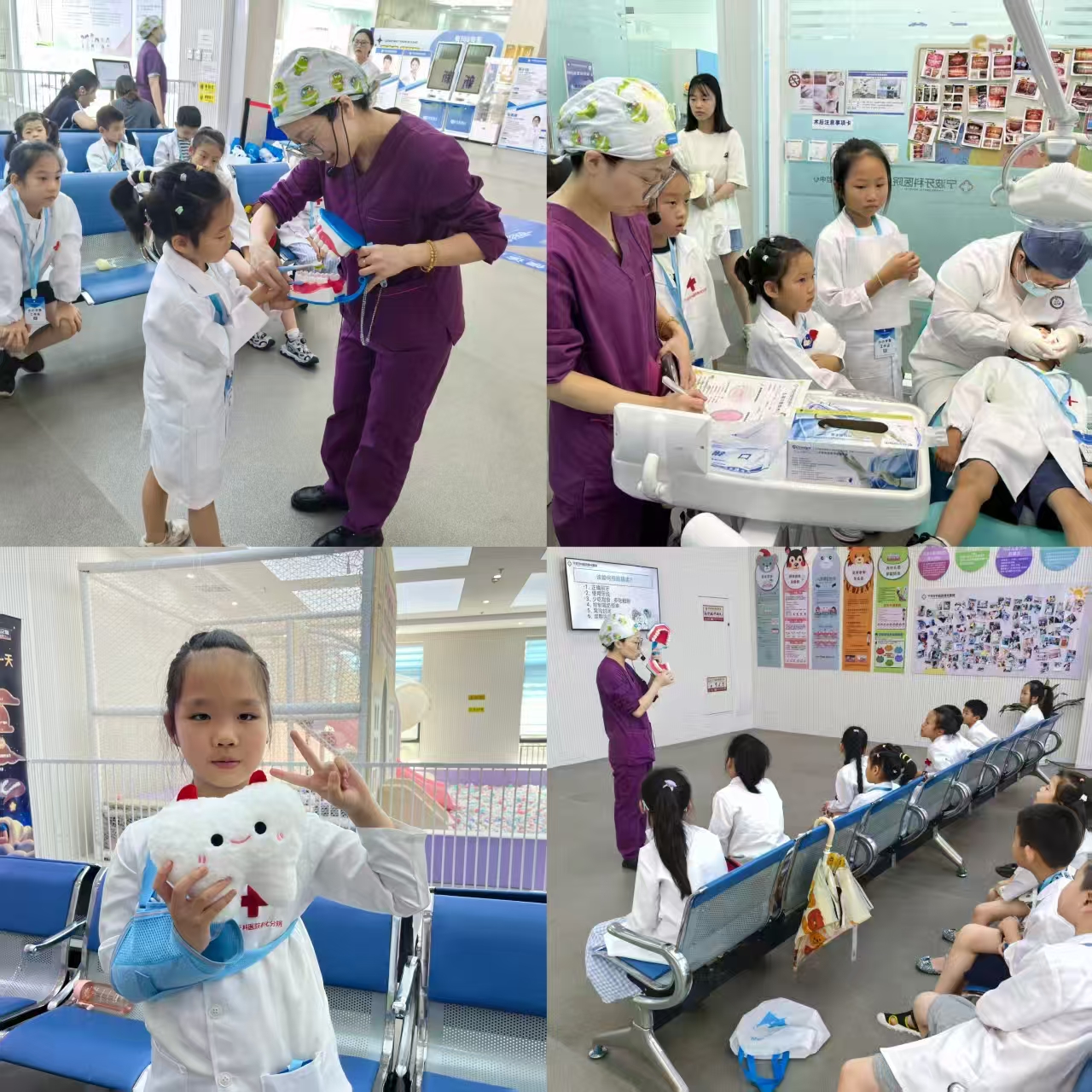 在专业口腔医生的指导下,小朋友们穿上白大褂,有模有样地开始了他们的“职业生涯”。从参观诊室、认识牙科器械,到学习正确的刷牙方法,每一个环节都让孩子们兴奋不已。这场沉浸式的职业体验,不仅让孩子们了解了牙医的工作内容,更在他们心中播下了职业梦想的种子。