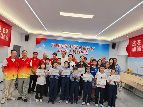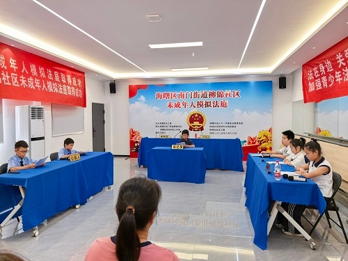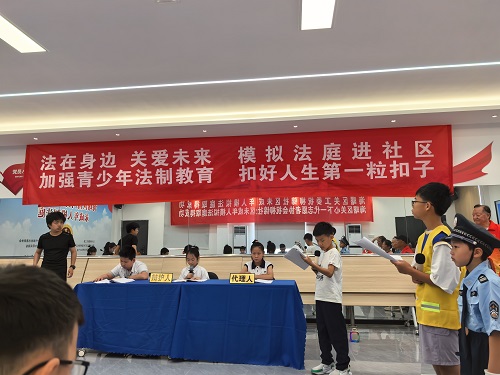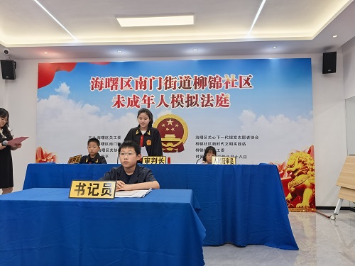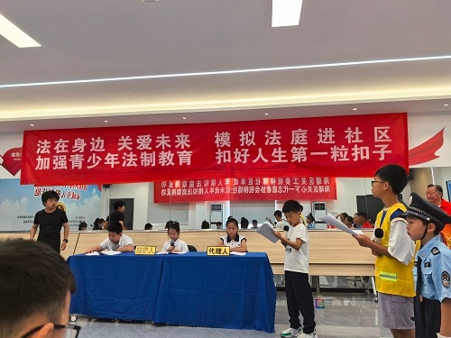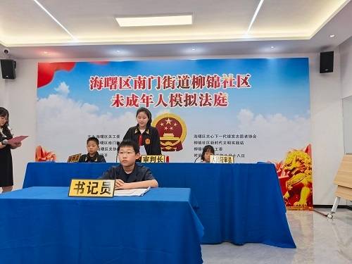 "全体起立!现在开庭!"随着"审判长"稚嫩却坚定的声音响起,8月18日上午,一场别开生面的"模拟法庭"在柳锦社区活动中心"开庭"。14岁的审判长身着黑色法袍,神情庄重地敲响法槌;11岁的"公诉人"字正腔圆地宣读起诉书;最引人注目的是年仅7岁的"人民陪审员",虽然个头还够不着桌面,却一丝不苟地整理着材料......这不是普通的角色扮演,这是柳锦社区联合海曙区关工委精心策划的青少年模拟法庭现场。