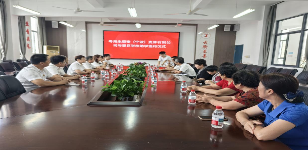 爱心传递温暖,助学点亮希望。9月11日下午,粤海永顺泰(宁波)麦芽有限公司与北仑区郭巨街道关工委助学签约仪式在郭巨学校会议室隆重举行。粤海永顺泰麦芽公司党支部书记、董事、总经理陈兆锋,党支部委员、副总经理洪柳亚,郭巨街道关工委常务副主任柴建军,郭巨学校校长张承志等出席仪式,与受助学生、家长及教师代表共同见证了这一温暖而庄重的时刻。