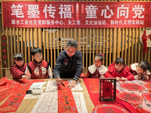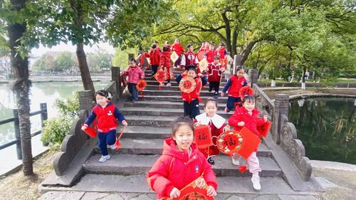 “叔叔阿姨,新年快乐!这是我们写的福字!”近日,北仑区戚家山联合工业社区蛟山阁前暖意融融,一群身着红色马甲的萌娃手捧福字与春联,蹦蹦跳跳地走进万商城沿街商铺,将新春祝福送到商户手中。